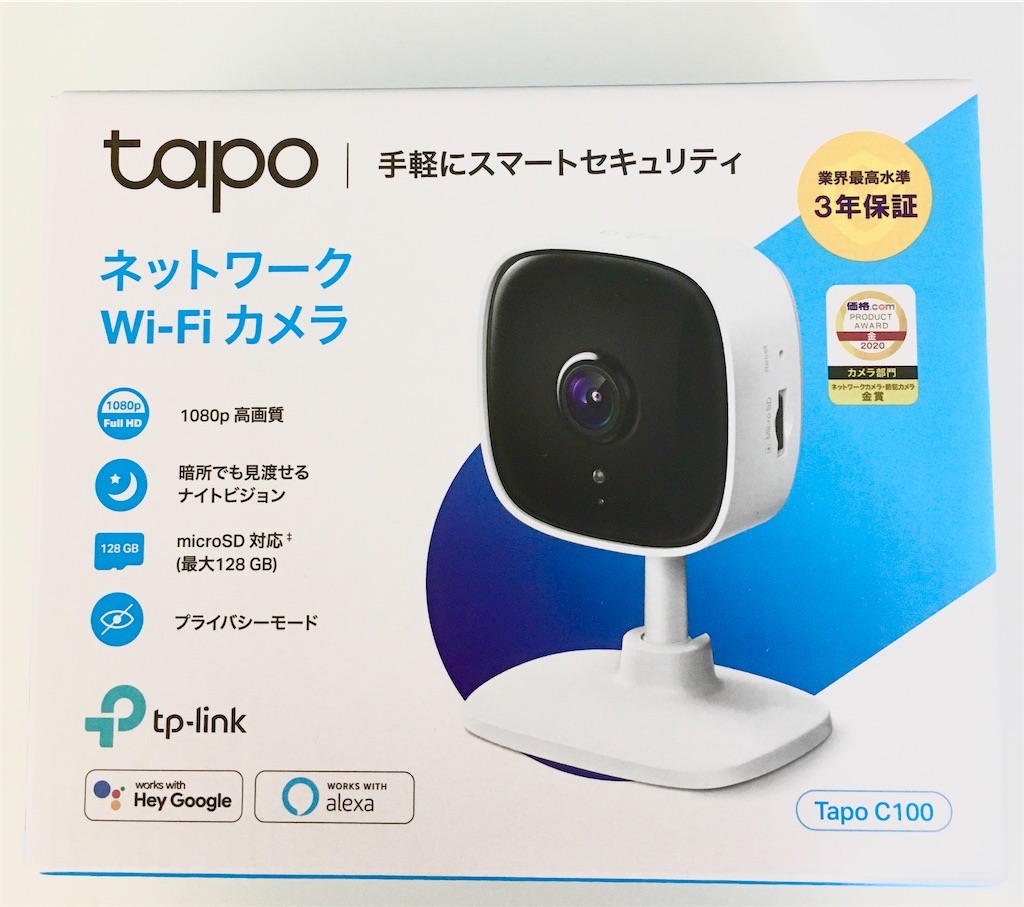 そんなわけで、購入した商品がこちらです。「tp−linkのtapo C100」という商品です。私はネットで購入しましたが、最近では家電量販店でもちらほら見かけます。
