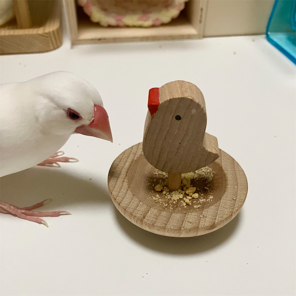 食べてる途中でたまに、大きく揺らぐのですが、その時は多少ビビってます。フォージング(=餌探し行動)になっているのかは定かではありませんが・・・このひよこみたいなデザインが可愛いですよね。